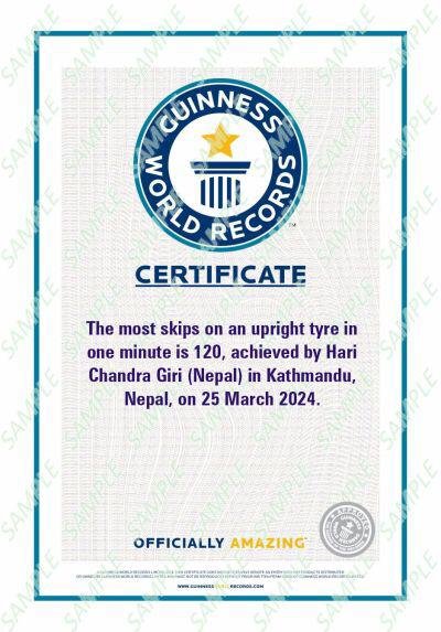 Kathmandu, June 6: Hari Chandra Giri, a Nepali Army man, has made history by setting a record for most skips on an upright tyre in one minute. His impressive 120 skips has potentially secured him a place in the Guinness World Records. He demonstrated his skills in the premises of the Nepali Army Headquarters in Kathmandu, Nepal.