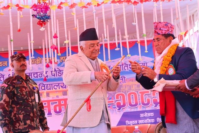 The buttenali was handed over to President Paudel by Chairman of the Tribhuvan Secondary School, Ram Bahadur KC, amidst a programme on Thursday. The President arrived in Baglung to address the diamond jubilee celebration programme.