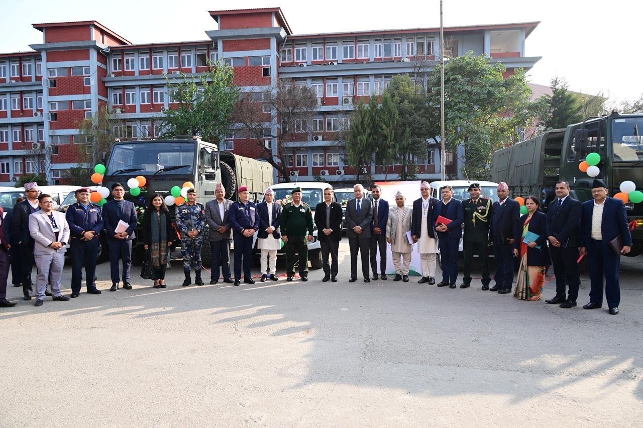 The third tranche of assistance gifted to the Government of Nepal includes more than 270 vehicles, including 50 trucks for the Nepali Army, and other supplies, in accordance with the assistance sought by Nepal for preparations related to the upcoming elections in the country. The trucks for the Nepali Army were received by the Chief of Army Staff, General Ashok Raj Sigdel, from Ambassador H.E. Naveen Srivastava.